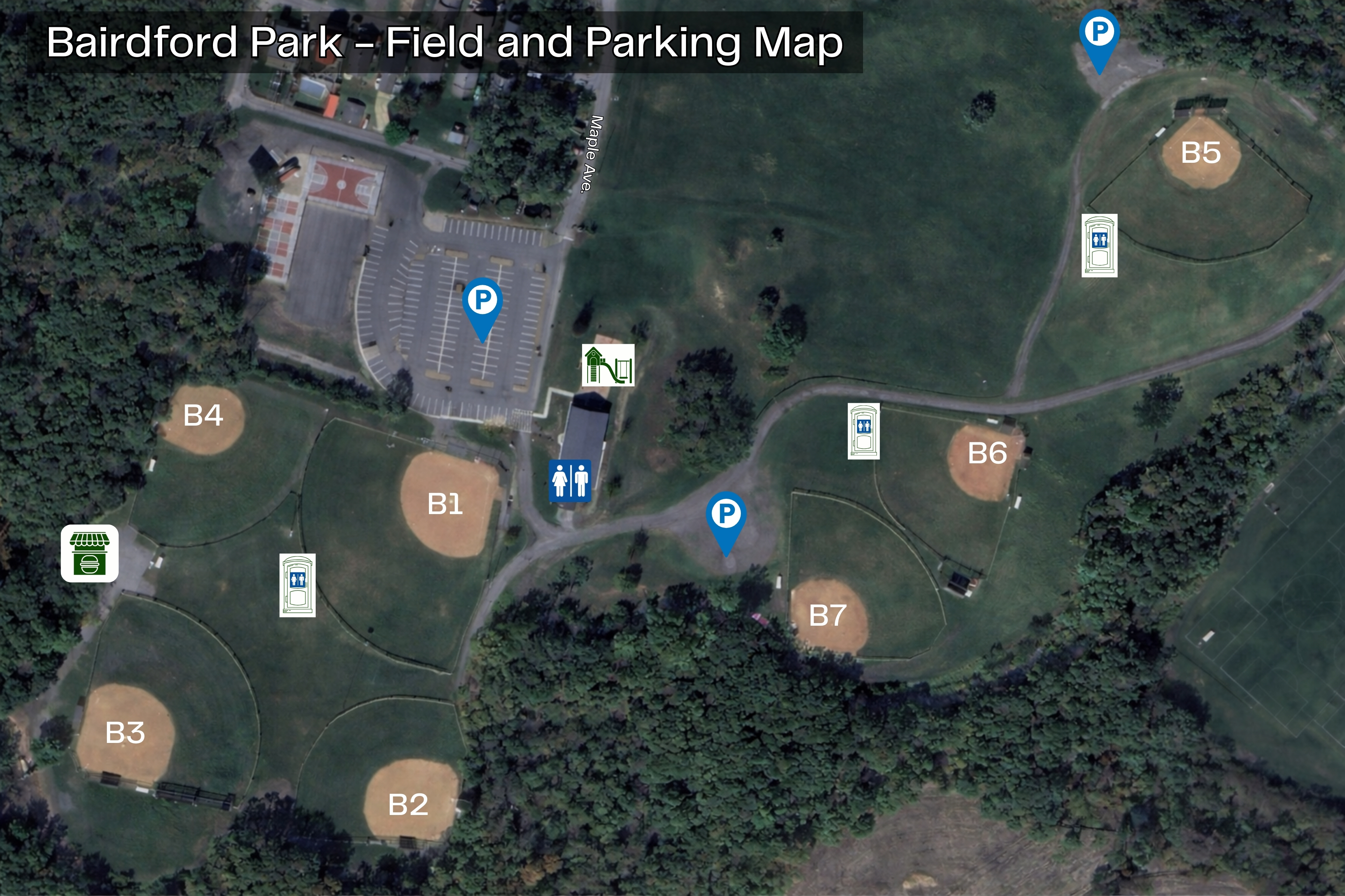 Field and Parking Map Map shows field locations, parking areas, restrooms, and concessions.