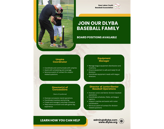 These positions help support our players, families, and overall league experience. You don’t need to be an expert — just someone who cares about our baseball community and wants to help.