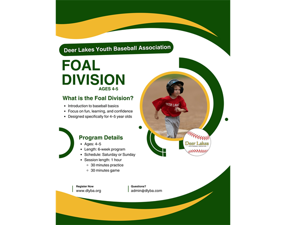 Registration for the Foal Division is part of Spring 2026 DLYBA Baseball Registration.